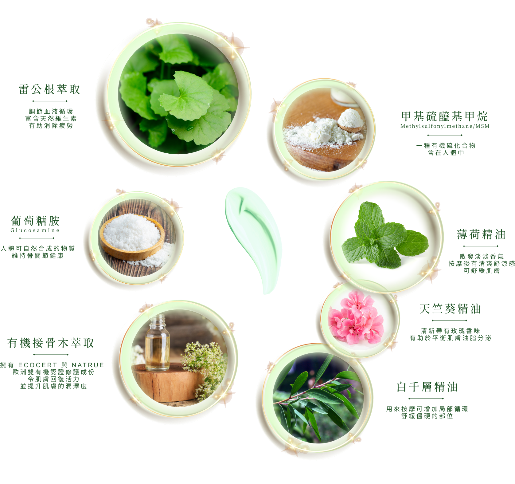 蠶絲油、荷荷芭油、有機接骨木萃取、維生素E醋酸酯、雷公根、MSM、GLUCOSAMINE、薄荷精油、天竺葵精油、白千層精油、尿囊素、柏木精油